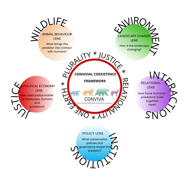 Our article sets out a blueprint for transdisciplinary collaboration and a framework to better understand human-predator interactions, rooted in convivial conservation (Massarella et al., 2021). Addressing shortcomings in existing literature, our approach focuses on power, political economy and history, overcomes disciplinary silos, celebrates plural knowledges beyond western science, and goes beyond conflict. We emphasised firstly the need to build into transdisciplinary projects collaborative, dialogue-based reflections, bringing together researchers and conservation practitioners from different disciplines. This iterative collaboration resulted in a framework of five interconnected dimensions of analysis and lenses with guiding questions to operationalise our insights.