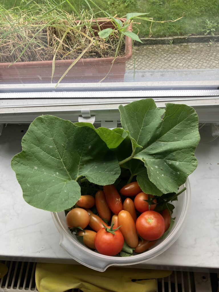 By July the garden was in full swing. The pumpkin vine spread out, the sunflowers bloomed and the tomatoes began to ripen. Curious neighbours would stop and express their support for our garden. Kids would drop by and taste fresh tomatoes. Birds and bees became frequent visitors as did earthworms and ants. I spent a lot of time outside, sometimes just admiring the plants and collecting harvest at other times.
