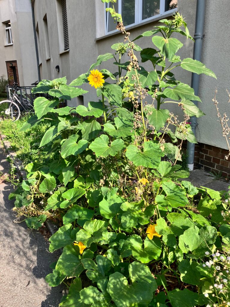 As any self-respecting gardner knows, the first step towards gardening is soil building. So, we started by collecting all our kitchen scraps and burying them in the small strips of land in front of our house. This was much needed because the soil had been ripped of nutrients by the monoculture short-cut lawn. As spring came, we planted some sunflowers, mallows, pumpkins in the land patch. When small shoots appeared, they were hardly distinguishable from the rest of the grass and we were afraid that they would be mowed away. At this point, we had another chat with the gardner. He was skeptical of our experiment but indulged us as long as we promised to take care of whatever we were trying to do.