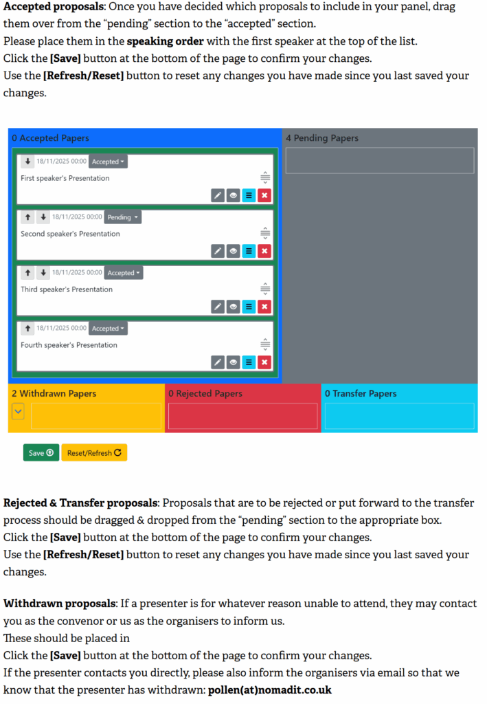 Withdrawn is for when authors inform you or us that they are no longer able to proceed with that proposal or attend the conference. They do not always email us with this news so if you receive such information later in the process, please remember to move their papers to ‘Withdrawn’ and let us know by email: pollen(at)nomadit.co.uk
